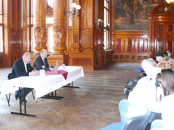 Saský předseda vlády Georg Milbradt s hejtmanem Josefem Pavlem na tiskové konferenci - Rumunský chargé d'affaires a.i. Dan Balanescu - 1.4. 2008